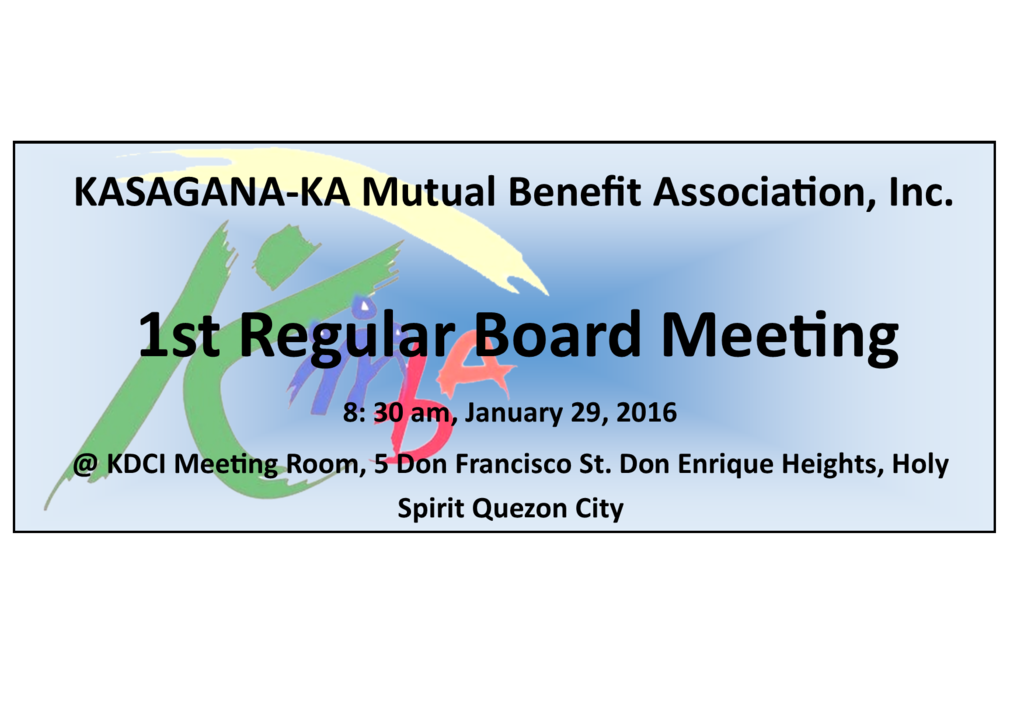KMBA is inviting you to attend its 1st Regular Board Meeting on January 29, 2016 to be held at KDCI Meeting room, located at 5 Don Francisco St. Don Enrique Heights, Holy Spirit Quezon City. Meeting will start at exactly 8:30 a.m to discuss the following matters.