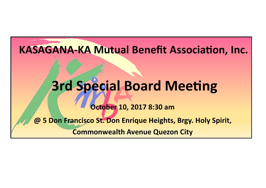 Please be informed that KMBA will have its 4th Regular Board Meeting on August 24, 2017, 8: 30 am at KDCI Head office, 5 Don Francisco St., Don Enrique Heights, Brgy. Holy Spirit Quezon City to discuss the following matters.